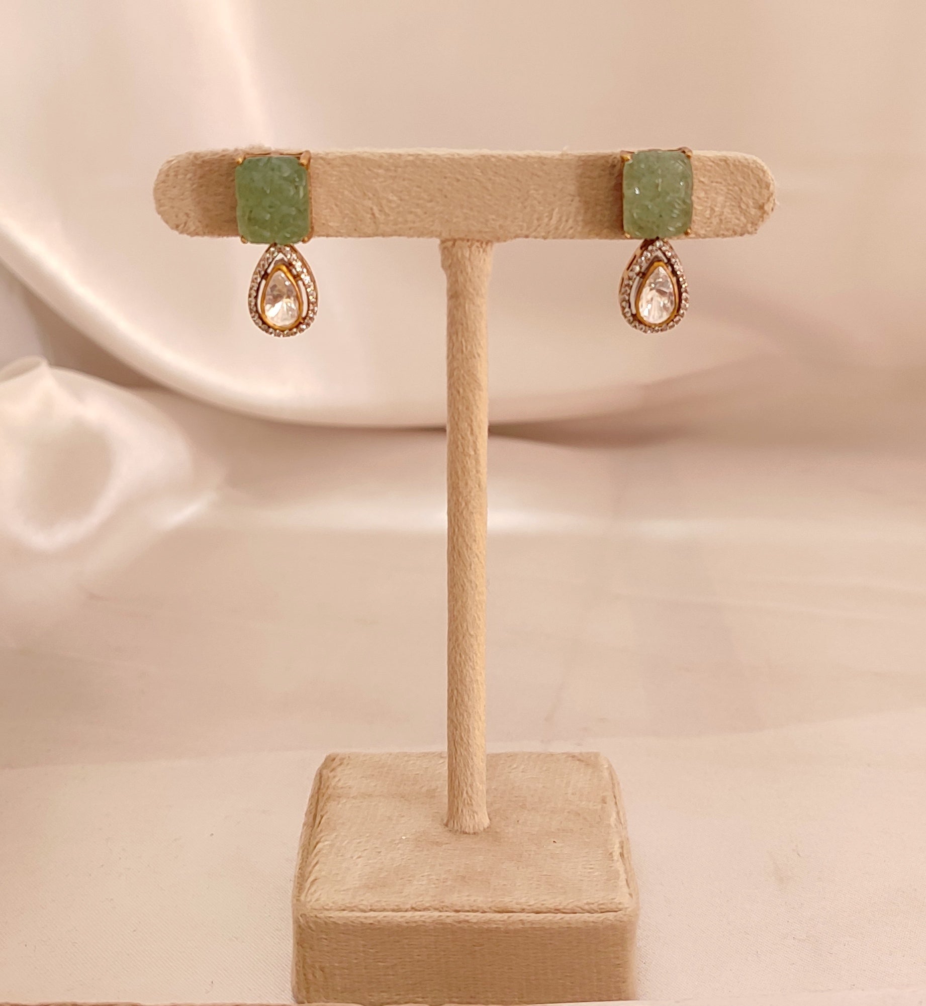 A regal blend of tradition and opulence, the Elysian Emerald Drops Earrings & Pendant Set by Arka Jaipur feature intricately carved green stones paired with teardrop Polki drops, framed in shimmering CZ and gold plated in sterling silver. A timeless statement for modern royalty.